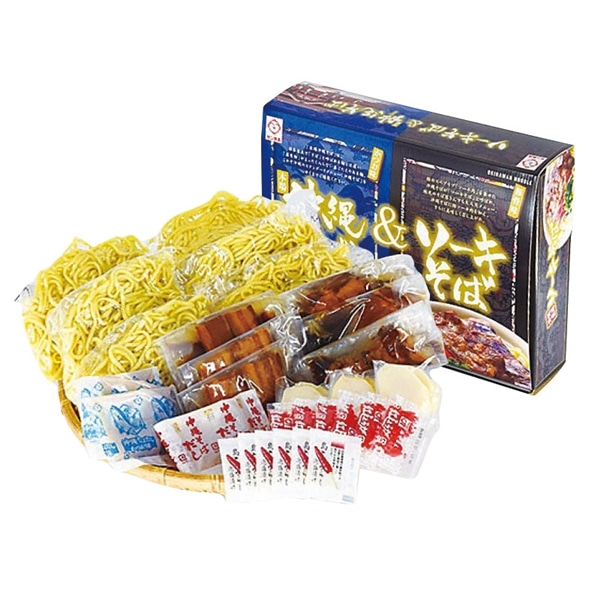 麺180g×6・濃縮そばだし豚骨×3・濃縮そばだし鰹×3・味付三枚肉2枚入×3・味付ソーキ肉2個入×3・かまぼこ2枚入×3・紅生姜×6・島唐辛子泡盛漬け×6(賞味期間17日)