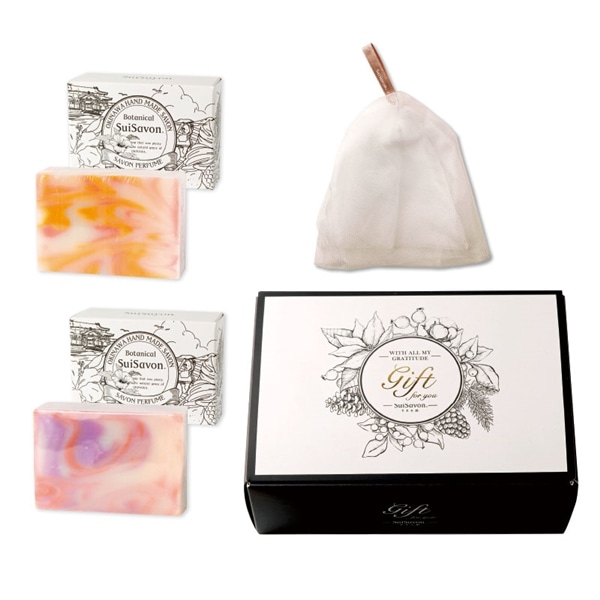 ・ボタニカルハンドメイド洗顔石鹸120g(太陽)※専用箱付 ・ボタニカルハンドメイド洗顔石鹸120g(花)※専用箱付               ・バレリーナネット(シルバー) ・オリジナルギフトBOX(小)