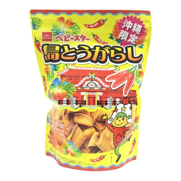 内容量:240g / 原材料:落花生、小麦粉、ポークエキス、ハブ酒、ヒハツ 他ベビースター 島とうがらし味 (170g)沖縄限定ピリッと辛い「島とうがらしパウダー」を練り込んだ幅広麺。お酒のつまみに最高な刺激です。