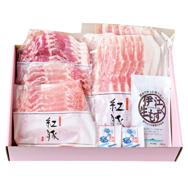 紅豚ローススライス150g×2、紅豚肩ローススライス150g×1、紅豚バラスライス150g×2、伊江島産生もずく100g×1、海水塩5g×2