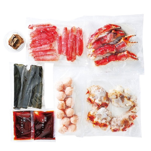 生冷たらばがにカット450g・生冷ずわいがにカット200g・かに団子180g・かにみそ20g・タレ50g×2袋・だし昆布15g