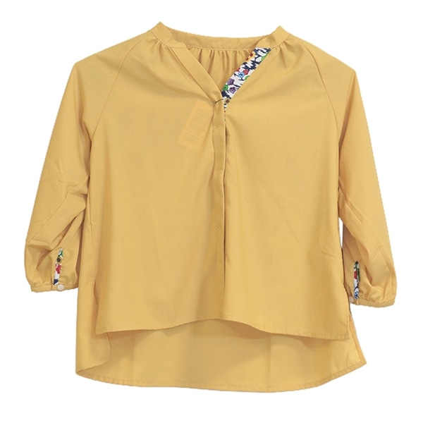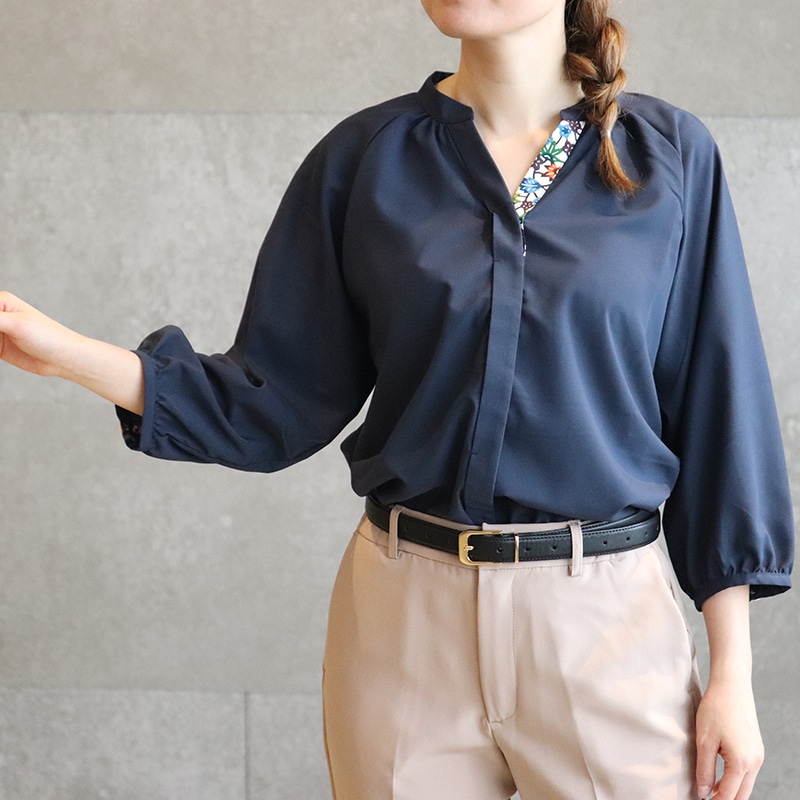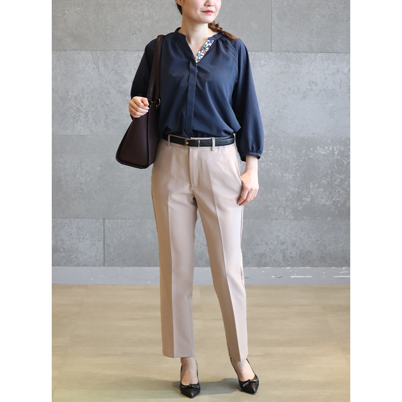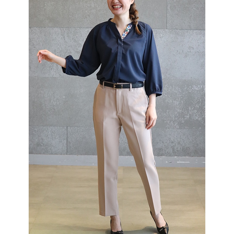 素材は伸縮性がありませんが、ゆったりしたデザインなので、体のラインをひろわないシルエットで、幅広い年齢の方にオススメです。 前身ごろの裾は、イン・アウト両方の着方ができ、ボトムやシーンに合わせたコーディネートの仕方ができます。