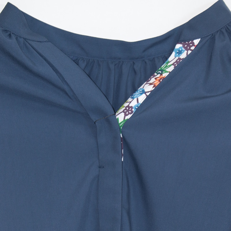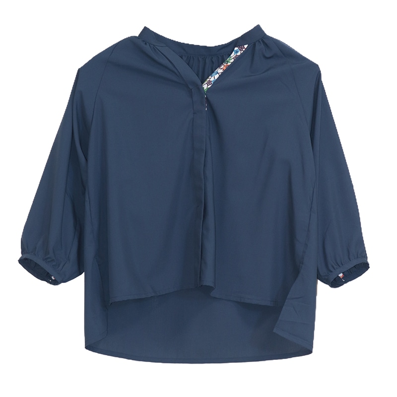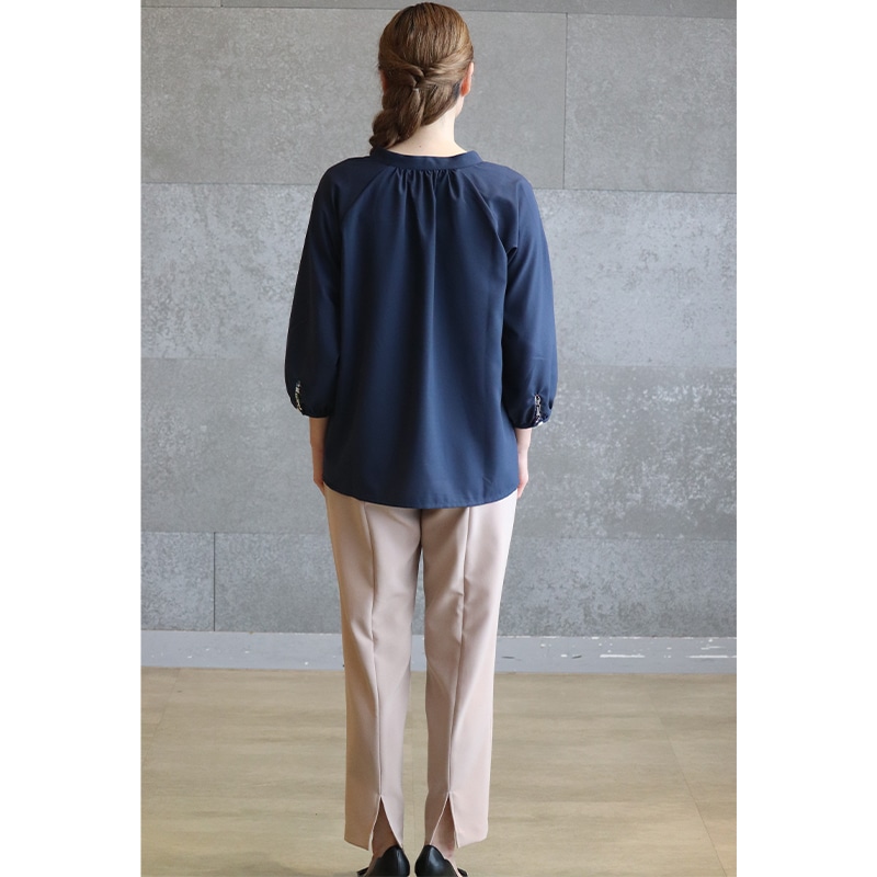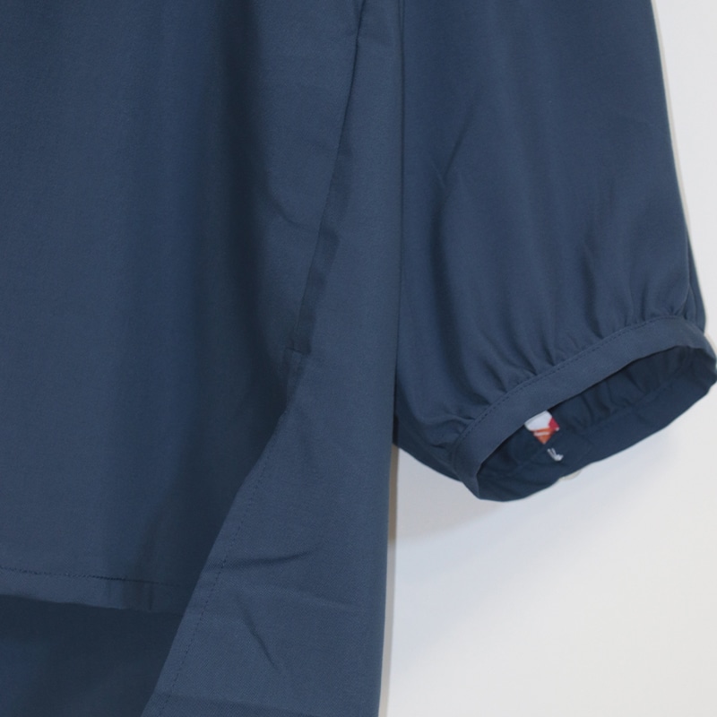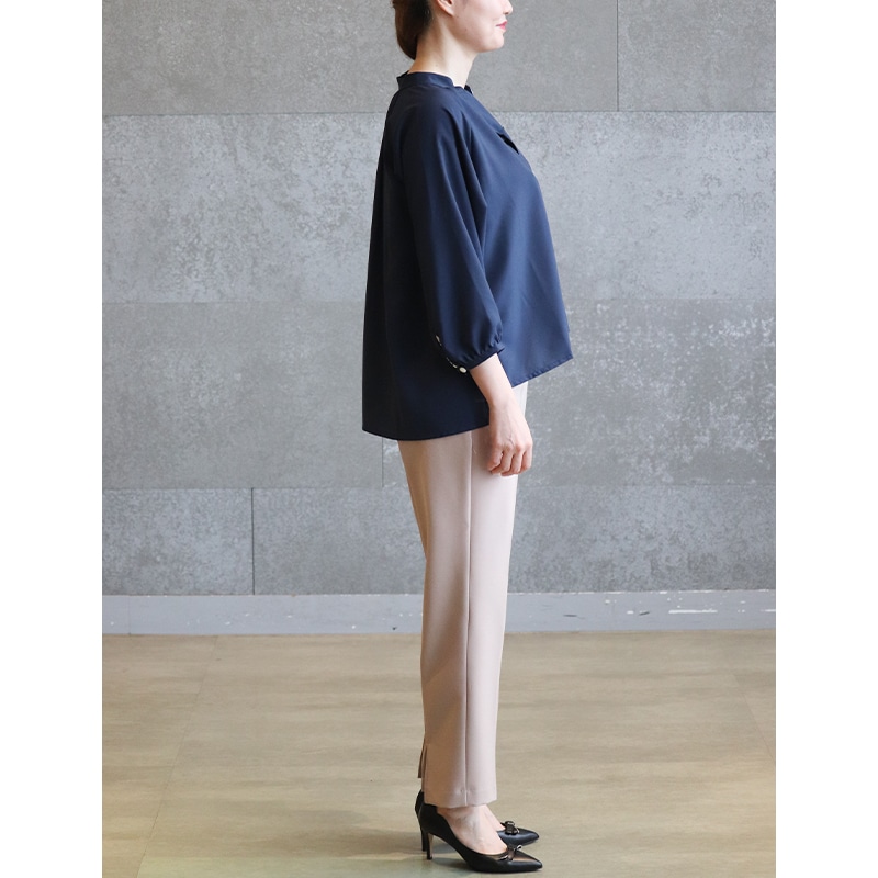 素材は伸縮性がありませんが、ゆったりしたデザインなので、体のラインをひろわないシルエットで、幅広い年齢の方にオススメです。 前身ごろの裾は、イン・アウト両方の着方ができ、ボトムやシーンに合わせたコーディネートの仕方ができます。