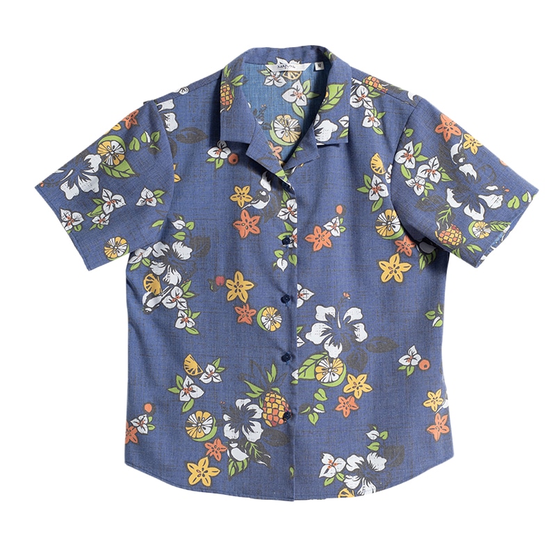 スターフルーツやシークヮーサーの鮮やかな色合いに、ハイビスカスやブーゲンビリアを重ね、愛らしいオキナワシジュウカラをそっと潜ませた遊び心のあるデザインです。カラフルな配色ながら、シケ感によって大人っぽい印象を演出。