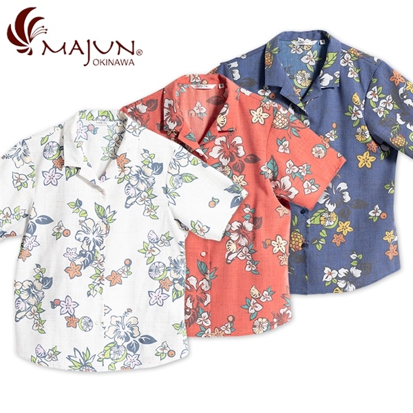 MAJUNの柄はすべてMAJUNオリジナルです。 沖縄の南国リゾートの雰囲気を抽出したエレガントで大胆な柄を提案しています。 それぞれの素材感を生かした柄も特徴です。