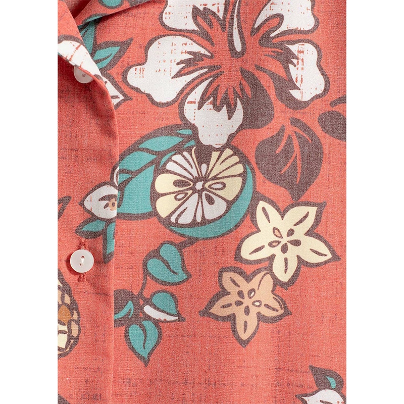 スターフルーツやシークヮーサーの鮮やかな色合いに、ハイビスカスやブーゲンビリアを重ね、愛らしいオキナワシジュウカラをそっと潜ませた遊び心のあるデザインです。カラフルな配色ながら、シケ感によって大人っぽい印象を演出。