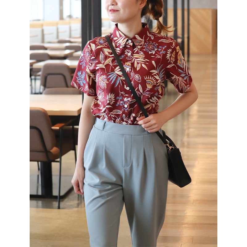 デイゴや琉球ツツジ、グロリオサ、ハイビスカスなどの南国の花々を更紗風にアレンジ。リーフを多めにあしらうことで、華やかさと上品さを両立したデザインに。かりゆしウェアの定番カラーに、アクセントの効いた個性的な色をプラスすることで、ナチュラルな美しさを際立たせます。