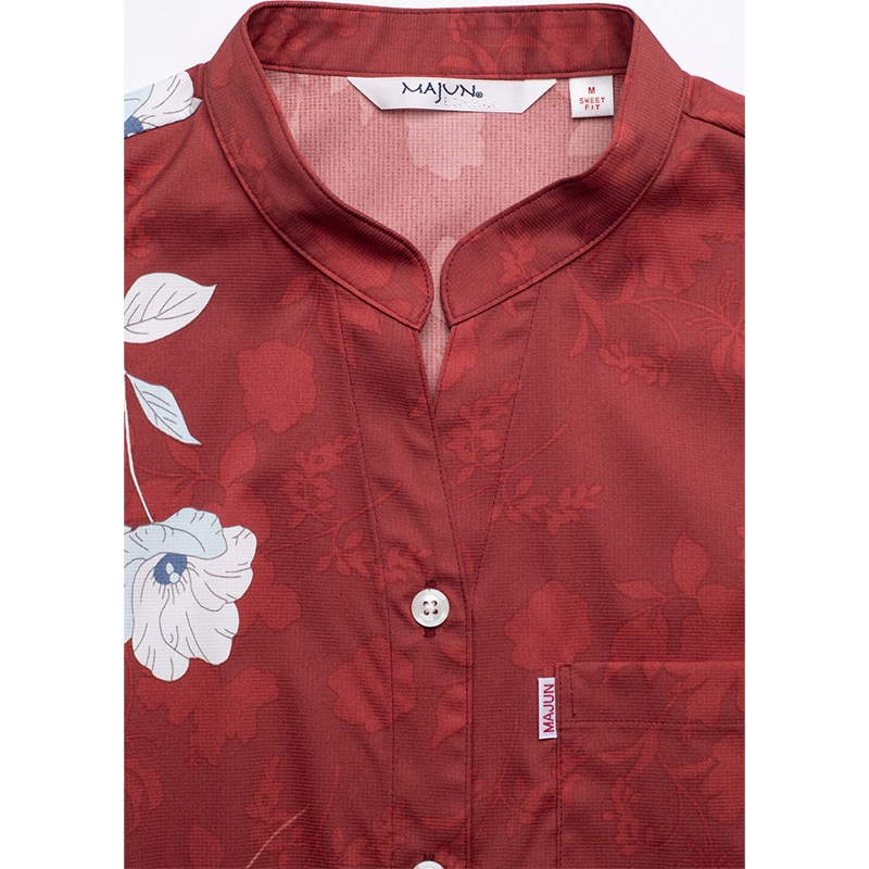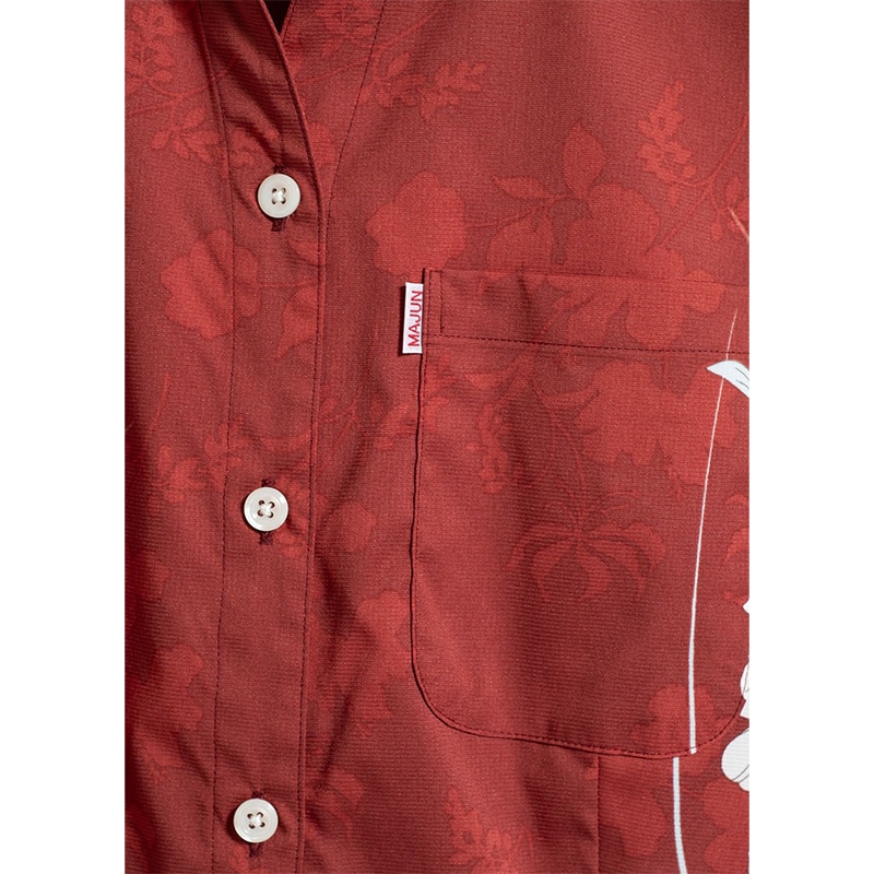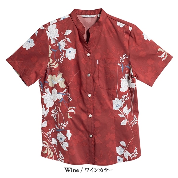 ユウナや月桃、八重咲ハイビスカスをモチーフにしたデザインで、シックな濃色と柔らかなアクセントカラーが大人の華やかさを引き立てます。デイリーにもオケージョンにも使えるシンプルかつ上品な一枚。 点接触によるさらりとした肌触りのフレリック素材は、ノーアイロンでお手入れも簡単。