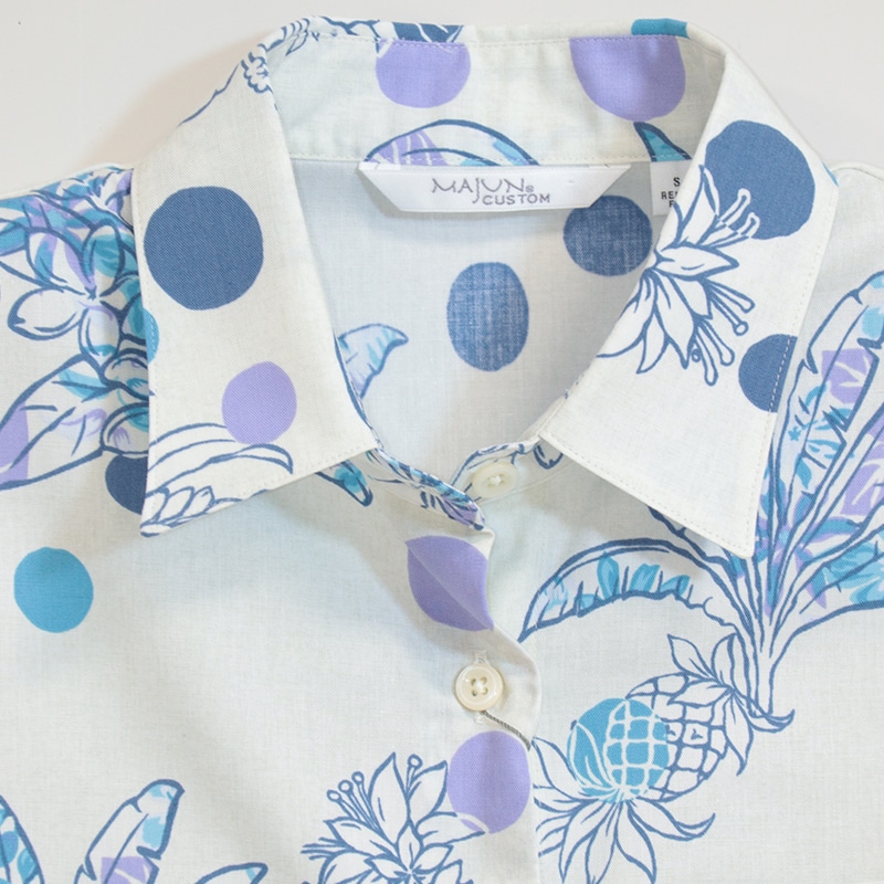 シャツの付属品と言えば、「ボタン」があります。 MAJUNではその「ボタン」選びにも徹底したこだわりを持っています。 プリントの柄や色に合わせ、ボタンの素材や色合いを選別し、着用シーンなども考慮し選定しています。 シャツのイメージで、キレイ目スタイル、ラフ間のあるカジュアルスタイル、それぞれのイメージに ボタンの素材感を組み合わせ商品企画し商品化しています。 天然素材「貝」や「ココナッツ」などボタンの存在感もしっかりシャツ全体を引き立てるように ワンランク上のものづくりをこだわっています。