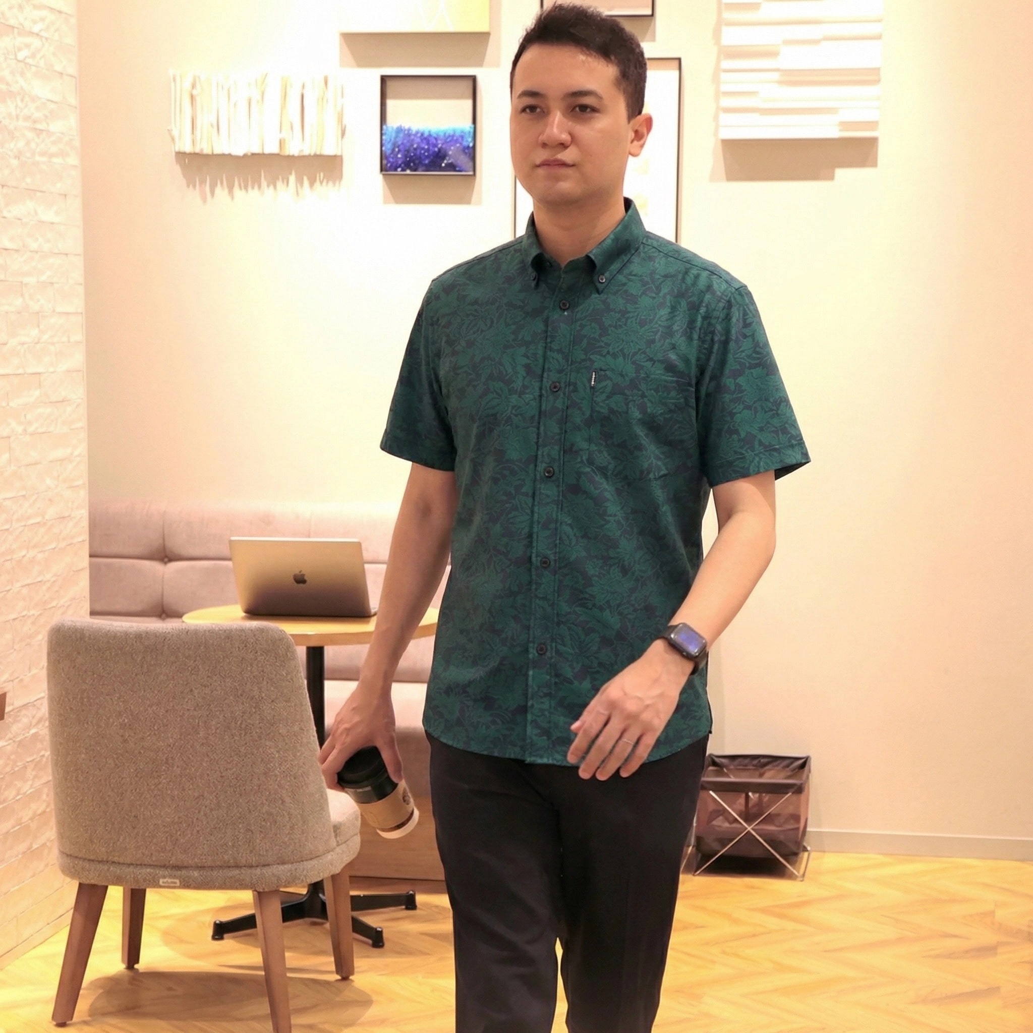 沖縄らしさを織柄で表現したジャガード生地は、ポリエステル混紡糸を使用し程よい光沢感とイージーケア性を両立。リサイクル繊維を使用した環境にも優しい国産シャツです。
