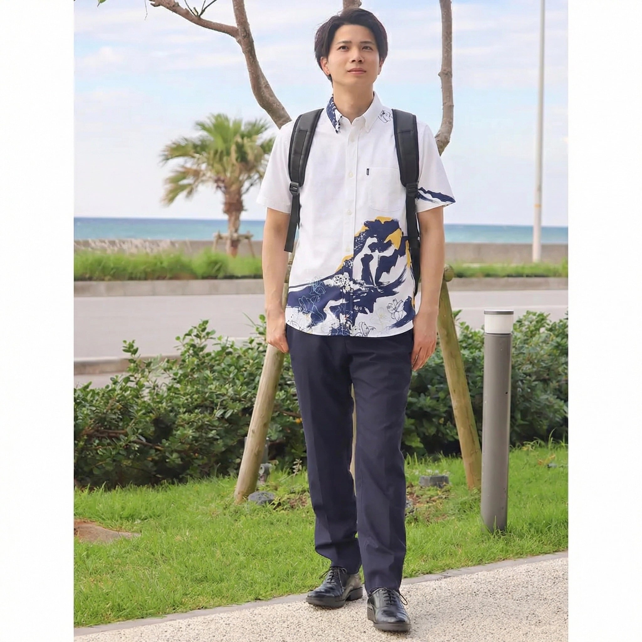 すっきりとしたボタンダウン襟とスリムなシルエットが男性らしさを引き立て、リゾートはもちろん結婚式やカジュアルなシーンでも品よく決まります。