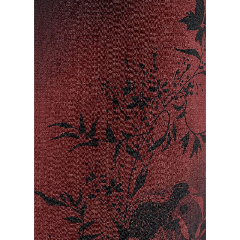 シダの葉やハイビスカスを重ねた落ち着きあるデザインに。深みのあるグラデーションの隙間からヤンバルクイナがそっと姿を見せる遊び心をプラス。
