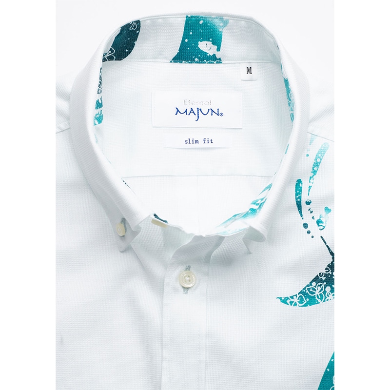 シャツの付属品と言えば、「ボタン」があります。 MAJUNではその「ボタン」選びにも徹底したこだわりを持っています。 プリントの柄や色に合わせ、ボタンの素材や色合いを選別し、着用シーンなども考慮し選定しています。 シャツのイメージで、キレイ目スタイル、ラフ間のあるカジュアルスタイル、それぞれのイメージに ボタンの素材感を組み合わせ商品企画し商品化しています。 天然素材「貝」や「ココナッツ」などボタンの存在感もしっかりシャツ全体を引き立てるように ワンランク上のものづくりをこだわっています。
