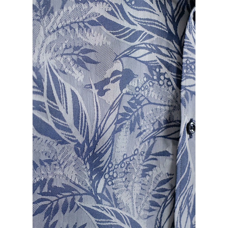 沖縄らしさを織柄で表現したジャガード生地は、ポリエステル混紡糸を使用し程よい光沢感とイージーケア性を両立。リサイクル繊維を使用した環境にも優しい国産シャツです。