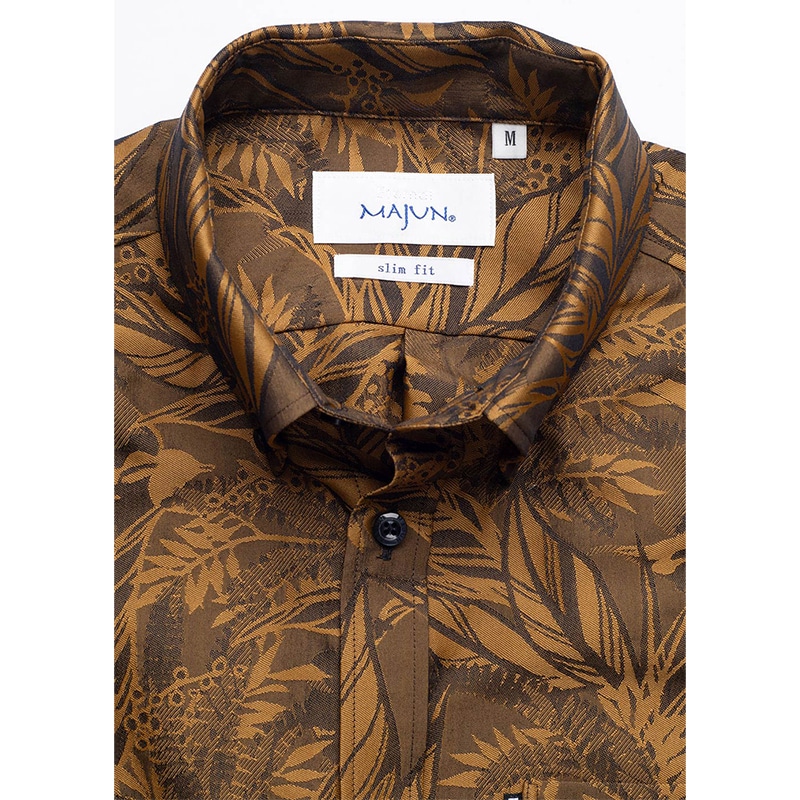 沖縄らしさを織柄で表現したジャガード生地は、ポリエステル混紡糸を使用し程よい光沢感とイージーケア性を両立。リサイクル繊維を使用した環境にも優しい国産シャツです。