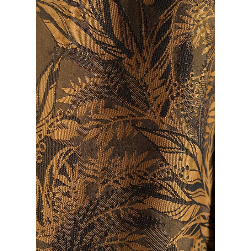 沖縄のシダ植物の中にヤンバルクイナなどの野鳥を忍ばせ、斜めにあしらった葉が洗練されたシャープさを演出。落ち着いた色合いで品よく着こなせ、贈り物にも人気です。