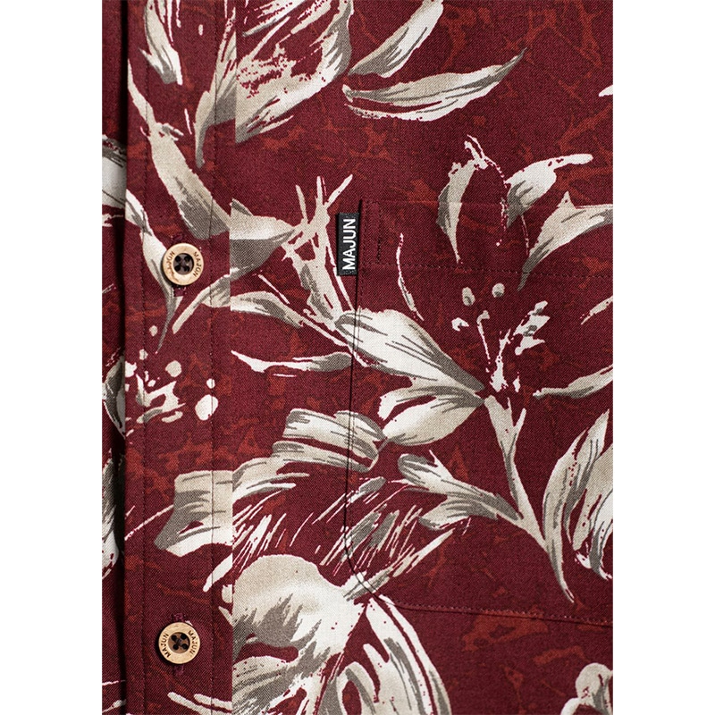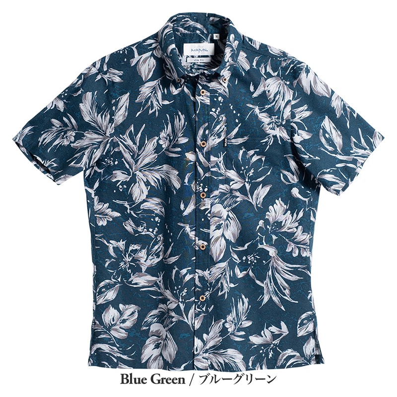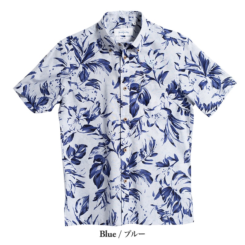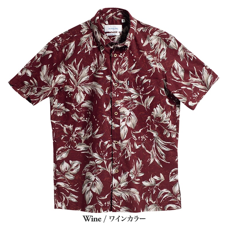 フイリソシンカ、テッポウユリ、プルメリアなどの南国植物をモチーフに、落ち着いた配色とブラシタッチで上品にデザイン。シックな配色が大人の魅力を際立たせる一着です。30番手の糸で織り上げた生地は適度な厚みとハリがあり、肌触りはなめらか。さらに、防シワ加工が施され、洗濯後もシワになりにくくお手入れが簡単です。
