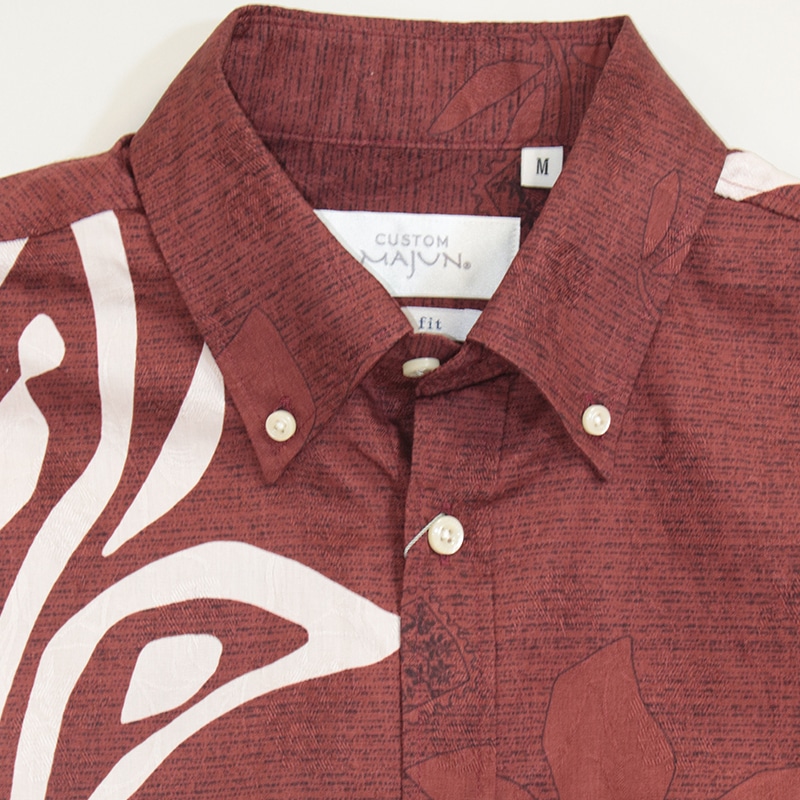 シャツの付属品と言えば、「ボタン」があります。 MAJUNではその「ボタン」選びにも徹底したこだわりを持っています。 プリントの柄や色に合わせ、ボタンの素材や色合いを選別し、着用シーンなども考慮し選定しています。 シャツのイメージで、キレイ目スタイル、ラフ間のあるカジュアルスタイル、それぞれのイメージに ボタンの素材感を組み合わせ商品企画し商品化しています。 天然素材「貝」や「ココナッツ」などボタンの存在感もしっかりシャツ全体を引き立てるように ワンランク上のものづくりをこだわっています。