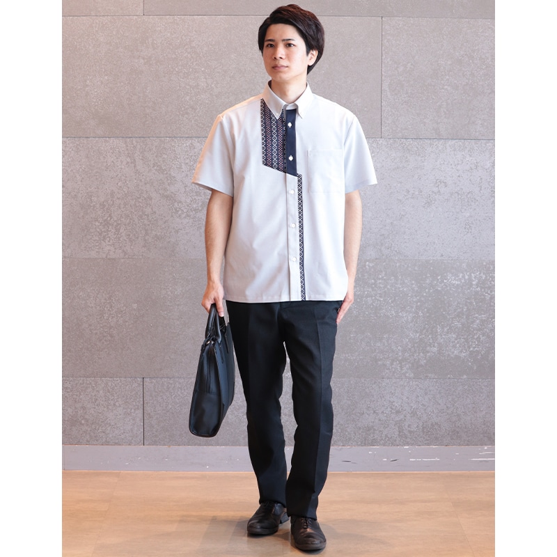 素材:(本体)ポリエステル100%(別布)ポリエステル100%(知花花織)絹100% /衿の形:ボタンダウン