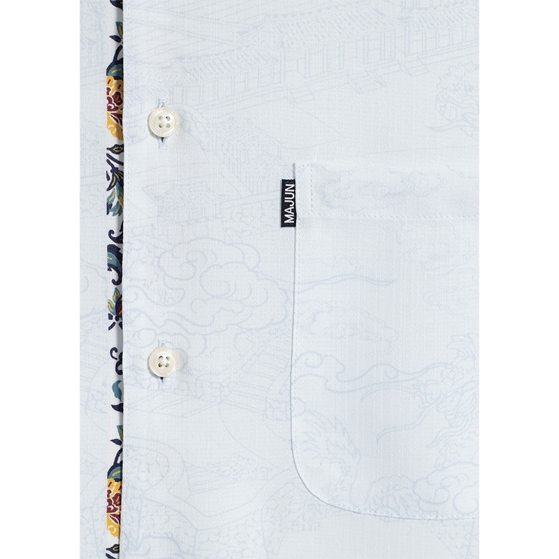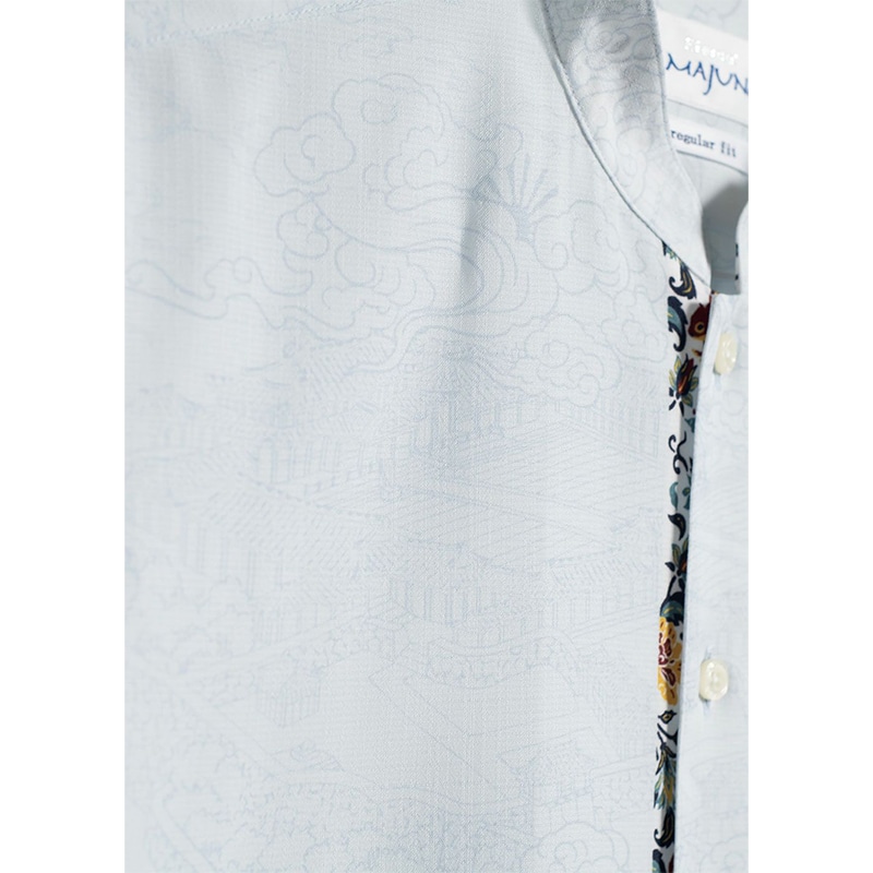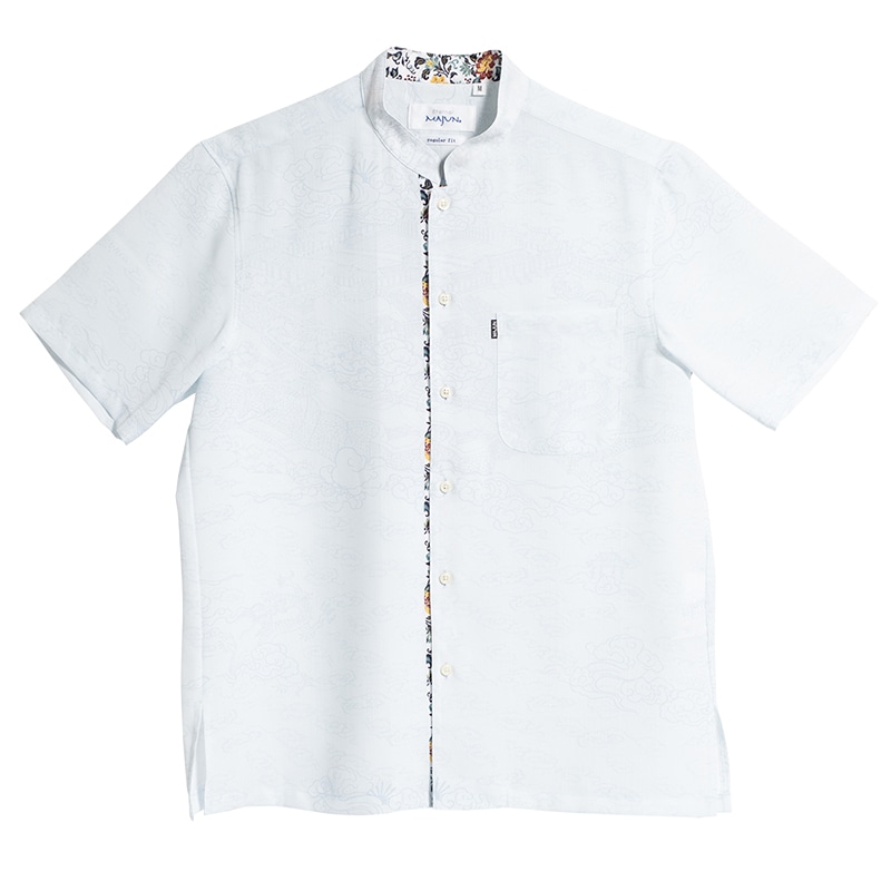 【首里城復興記念】毎年大好評の定番デザインに、新たな首里城モチーフが仲間入り。 朝日が昇る首里城と龍の姿を絵巻物風に描き、下前立てには牡丹・リス・葡萄といった王家の象徴をあしらいました。復元した首里城が永く愛されるよう祈り込めたデザインで、男性の装いに優しい存在感を添えます。 素材はドライタッチで吸水性のあるポリエステル100%のノーアイロン生地。リサイクル繊維を使用し、環境にも優しい国産シャツです。 控えめで整った印象のマオカラーは、ウェディング衣装や上品なカジュアルスタイルなど幅広いシーンで活躍します。