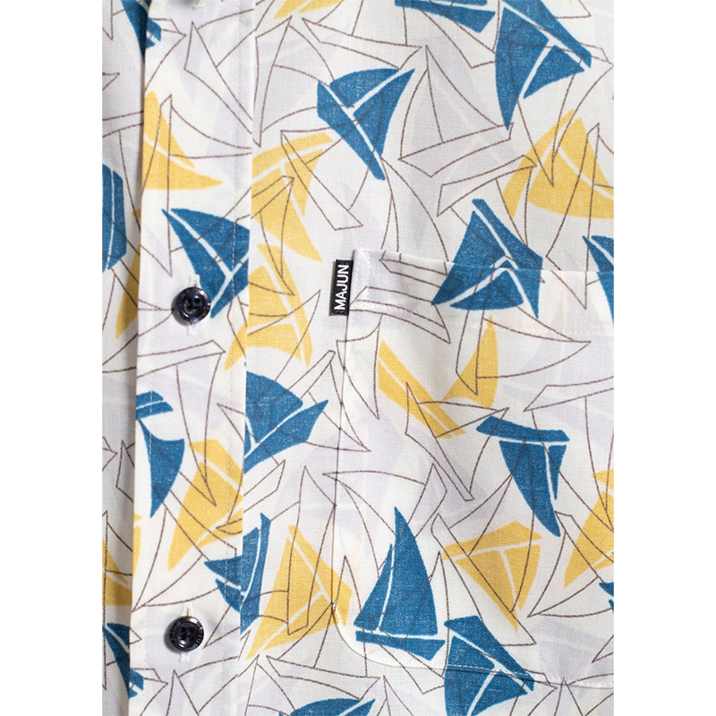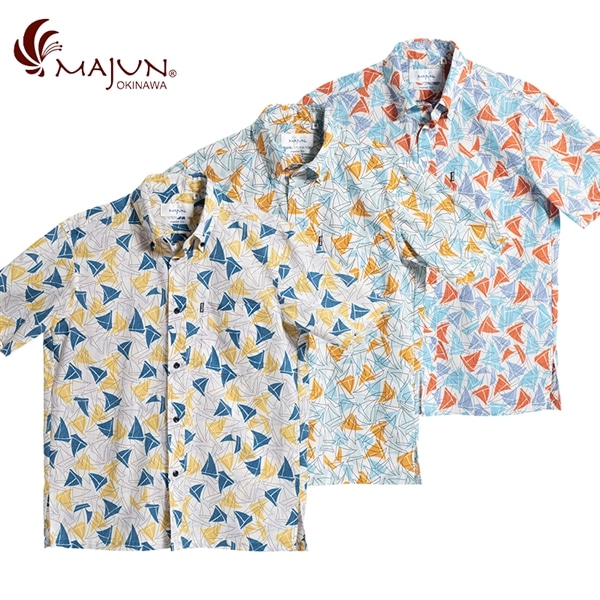 ヨットの帆が並ぶ中に、沖縄の伝統船「サバニ」をさりげなくあしらったマリンデザイン。鮮やかなアクセントカラーが、潮風を感じさせる爽やかな印象を演出。 生地にはオーガニックコットンとポリエステルの混紡糸を使用し、透けにくく、イージーケアで快適な着心地を実現。