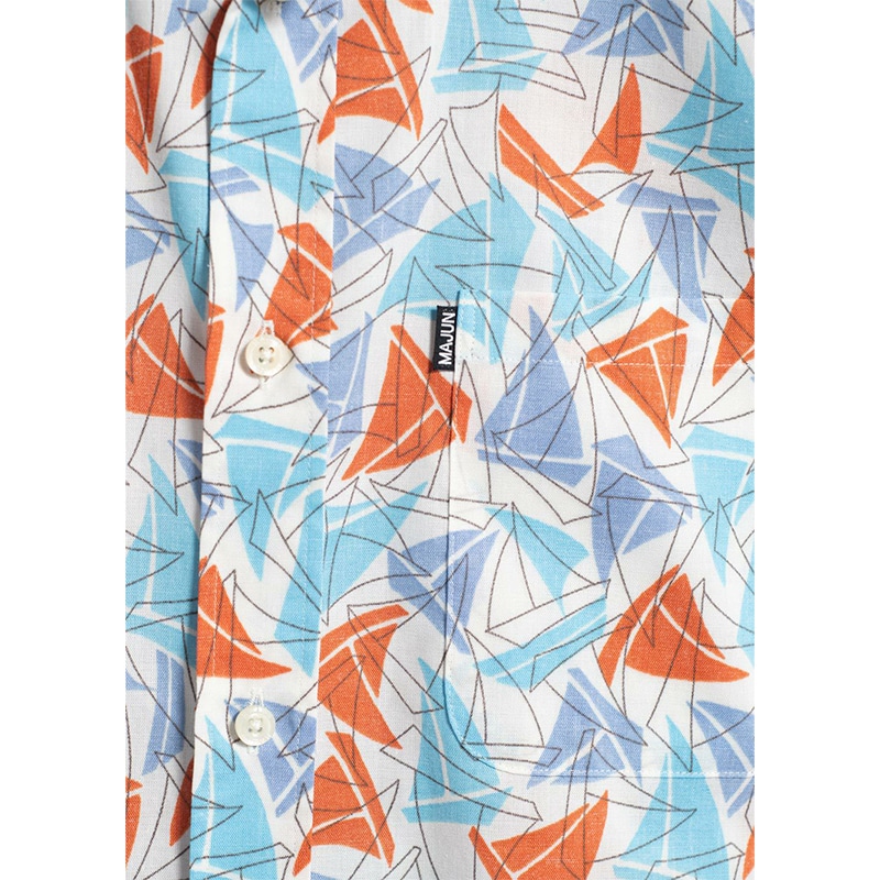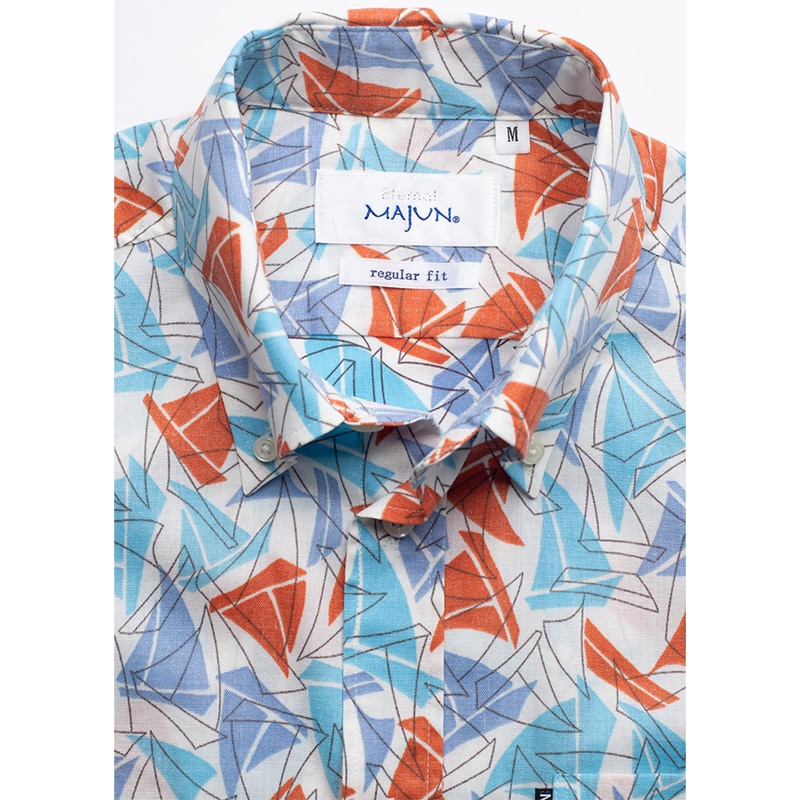 ヨットの帆が並ぶ中に、沖縄の伝統船「サバニ」をさりげなくあしらったマリンデザイン。鮮やかなアクセントカラーが、潮風を感じさせる爽やかな印象を演出。 生地にはオーガニックコットンとポリエステルの混紡糸を使用し、透けにくく、イージーケアで快適な着心地を実現。