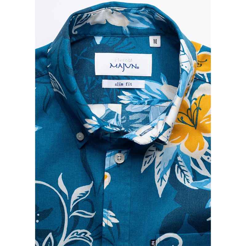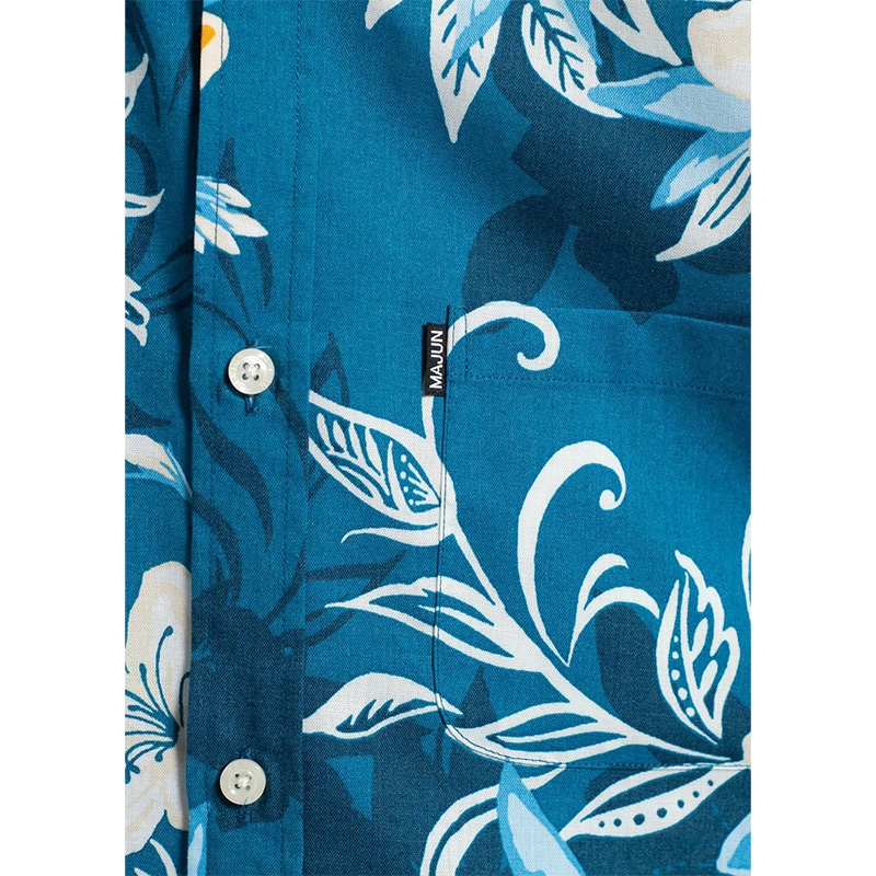 琉球ツツジの華やかさを、大胆なデザインとアクセントカラーで表現。白いモチーフが際立つ抜け感のある仕上がりで、爽やかさと上品さを両立しています。オーガニックコットンとポリエステルの混紡素材を使用したイージーケア生地で、透けにくくしっかりとした生地感ながら、軽やかな着心地を実現。