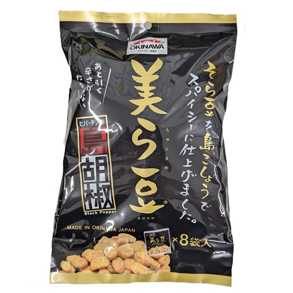 美ら豆島胡椒は、そら豆をブラックペッパーとヒバーチ(ヒハツ)でスパイシーに仕上げました。サクッとした食感とピリッととした辛さが癖になる豆菓子です。