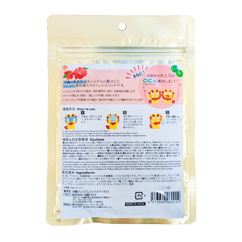 沖縄の美容成分をふんだんに配合したひたひた美容液入りのフェイスパックです。 ・ハイビスカス花エキス配合…肌を健やかに保ち、肌表面を保護します。 ・ゲットウ葉エキス配合…肌にハリや潤いを持たせます。 ・アキノワスレグサ葉/茎エキス配合…肌のキメを整えバリア機能をサポートします。 さらに世界中で大人気のCICA(ツボクサエキス)も配合しました