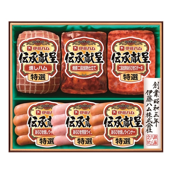 - 焼豚二段加熱仕立て160g、特選燻ハム180g、特選二段加熱あらびきステーキ110g、特選あらびき燻ウインナー80g×2、特選あらびき芳醇ウインナー80g