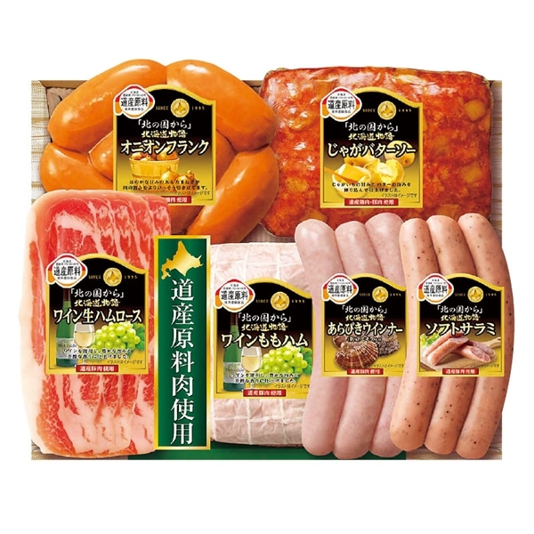 ワインももハム130g・ワイン生ハムロース35g・じゃがバターソー180g・オニオンフランク180g・ソフトサラミ75g・あらびきウインナー(帆立エキス入り)75g