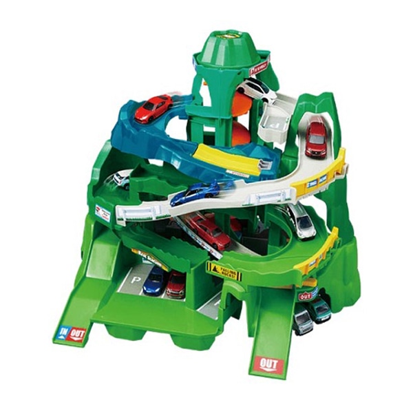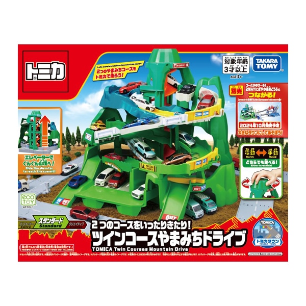 トミカがダブルエレベーターを登って、2つのやまみちコースをびゅんびゅん走りまわります。2コースが8の字のようにつながったロングコースになっており、たくさんのトミカを走らせて遊べます。