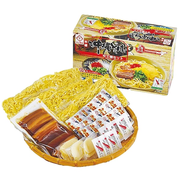 麺180g×6・粉末そばだし(豚骨味)×6・味付け三枚肉6枚入×1・かまぼこ2枚入×3・島唐辛子泡盛漬け×6(賞味期限17日)
