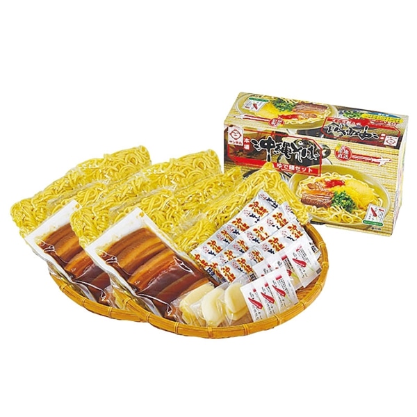 麺180g×6・粉末そばだし(豚骨味)×6・味付け三枚肉6枚入×1・かまぼこ2枚入×3・島唐辛子泡盛漬け×6(賞味期限17日)