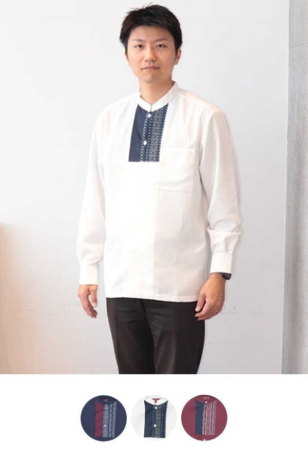 ネクタイいらずで、さらっと着れて着心地がよく、すぐにキマるデザインの長袖・七分袖かりゆしウェアです。